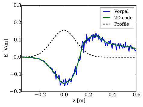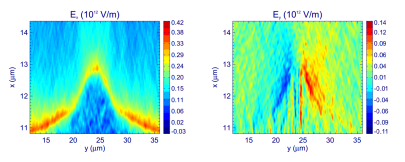Here, a laser hits a thin foil, which is immediately ionised. The electrons leave the material much faster than the much heavier ions, thus creating a strong space charge field. A thin layer of impurities on the foil, consisting of protons among other things, is accelerated in this space charge field. The acceleration takes place in a μm range behind the target. Injecting this beam into an ordinary periodic focussing structure (m-range) is a multi-scale problem, which can only be simulated with different, separate codes in independent space and time scales. At the department, the simulation tool VSim from the company Tech-X is used for this purpose, among others.